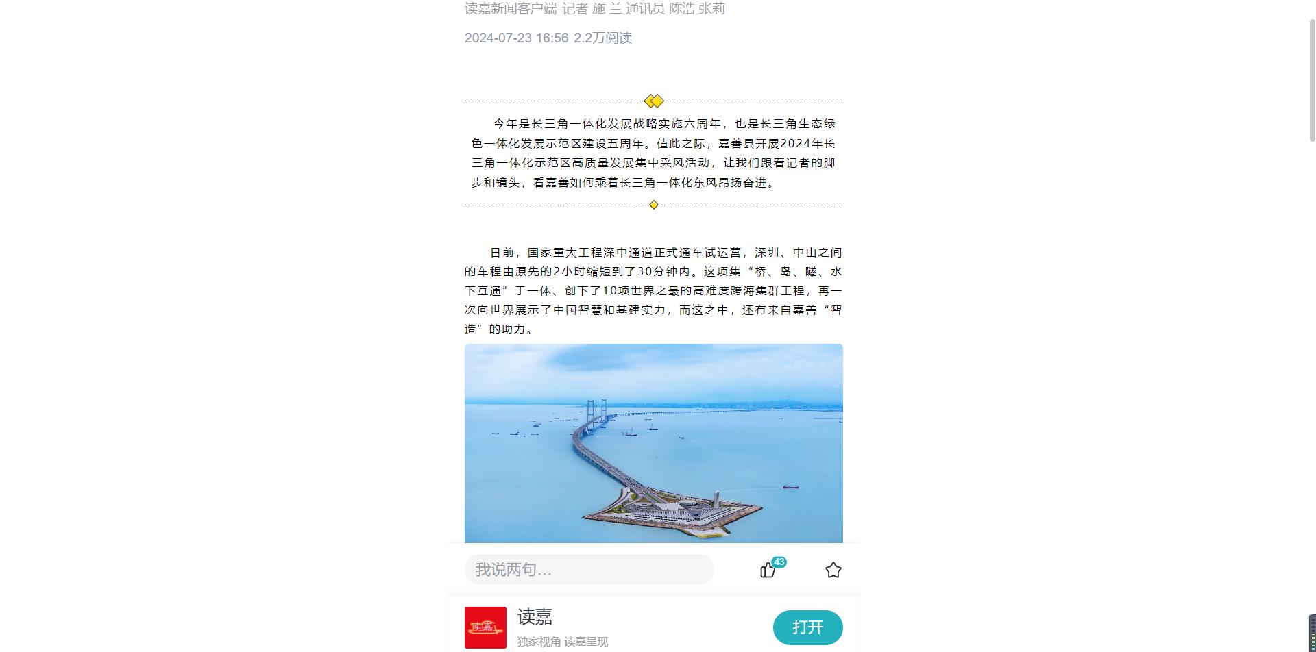 今年是長三角一體化發展戰略實施六周年,也是長三角生態綠色一體化發展示范區建設五周年。值此之際,嘉善縣開展2024年長三角一體化示范區高質量發展集中采風活動,讓我們跟著記者的腳步和鏡頭,看嘉善如何乘著長三角一體化東風昂揚奮進。