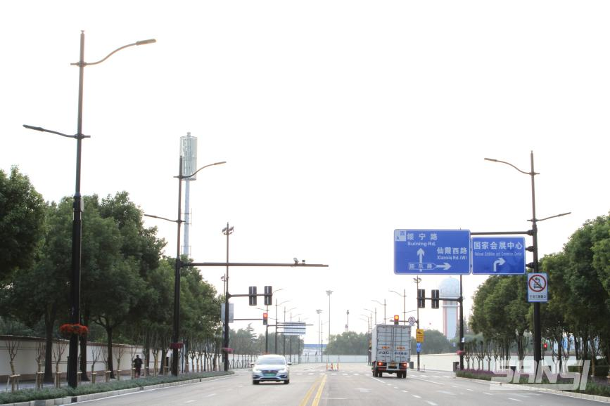 同年首屆進博會期間,上海三思便為國家會展中心周邊道路供應了500余套“多桿合一”。為保證其周邊道路安全(友樂路、迎樂路、聯虹路、綏寧路等),這些道路均采用了上海三思設計制造的新型“多桿合一”及解決方案。