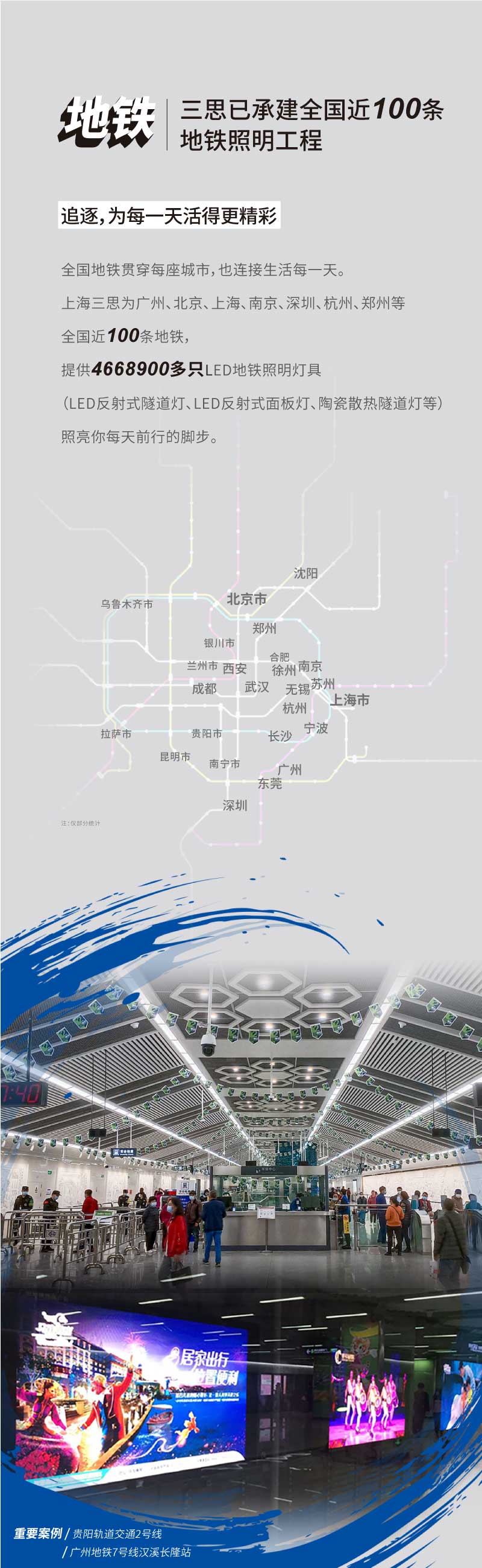 貴陽軌道交通2號(hào)線于2021年4月28日全線開通,全線總長(zhǎng)41.5公里,共32座車站。其中,上海三思服務(wù)共完成了此項(xiàng)目一期12站(公共區(qū)和區(qū)間隧道)、二期4站(設(shè)備區(qū))的照明設(shè)備供應(yīng),共計(jì)LED燈具數(shù)量達(dá)30000套。