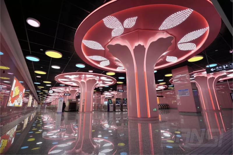 以錢湖南路站為例,該站以“繁花綻放”為主題,支柱造型設計為寧波市市花山茶花,寓意莘莘學子活力四射的精神面貌。三思發揮強大的定制能力,打造舒適而又富有特色的LED照明環境,造型獨特的異形燈在起到照明作用的同時,又很好地改善了地下空間原本沉悶的氛圍,增加了許多趣味性和藝術性,讓整個空間變得更加明亮又浪漫。