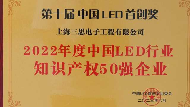 2023年6月9日,以“開啟中國LED高質(zhì)量發(fā)展黃金新十年”為主題的第十屆中國LED首創(chuàng)獎頒獎典禮在廣州朗豪酒店隆重舉行,上海三思電子工程有限公司(以下簡稱上海三思)榮獲第10屆中國LED首創(chuàng)獎“2022年度中國LED行業(yè)知識產(chǎn)權(quán)50強(qiáng)企業(yè)”。