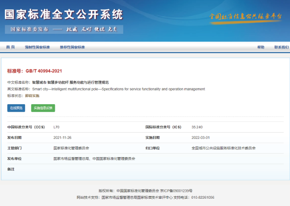查看詳細 >>這份上海三思參與起草的文件規定了包括道路多功能桿的總體要求、基本組成、桿體設計要求、附屬設施要求、檢驗要求以及標志、包裝、運輸和貯存等一系列行業標準。該標準重點指出:為滿足新型智慧城市需要,需要有效管理智慧桿的長期使用,制定并規范運營服務,包含信息管理、運行監控、維護等內容,使新型多功能桿可安全支持搭載移動通信設備、智能照明設備、視頻監控設備等。